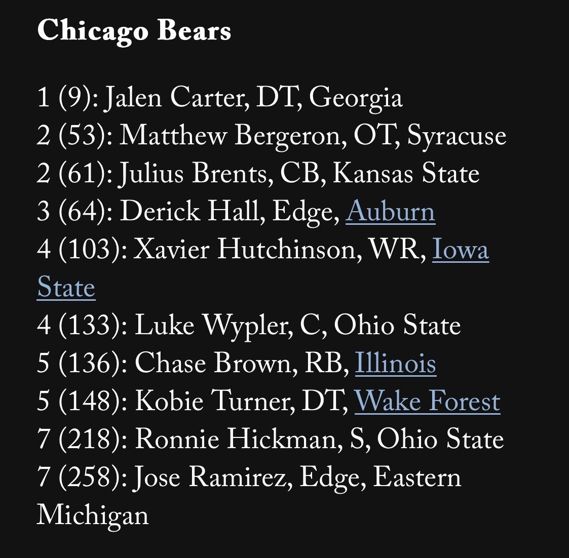 Carter is a big swing at 9.  Knowing next to nothing about everyone else except Chase Brown, I think that would be an acceptable draft.  Looks to add on OL and DL, decent look at a CB and WR, a RB who can produce...