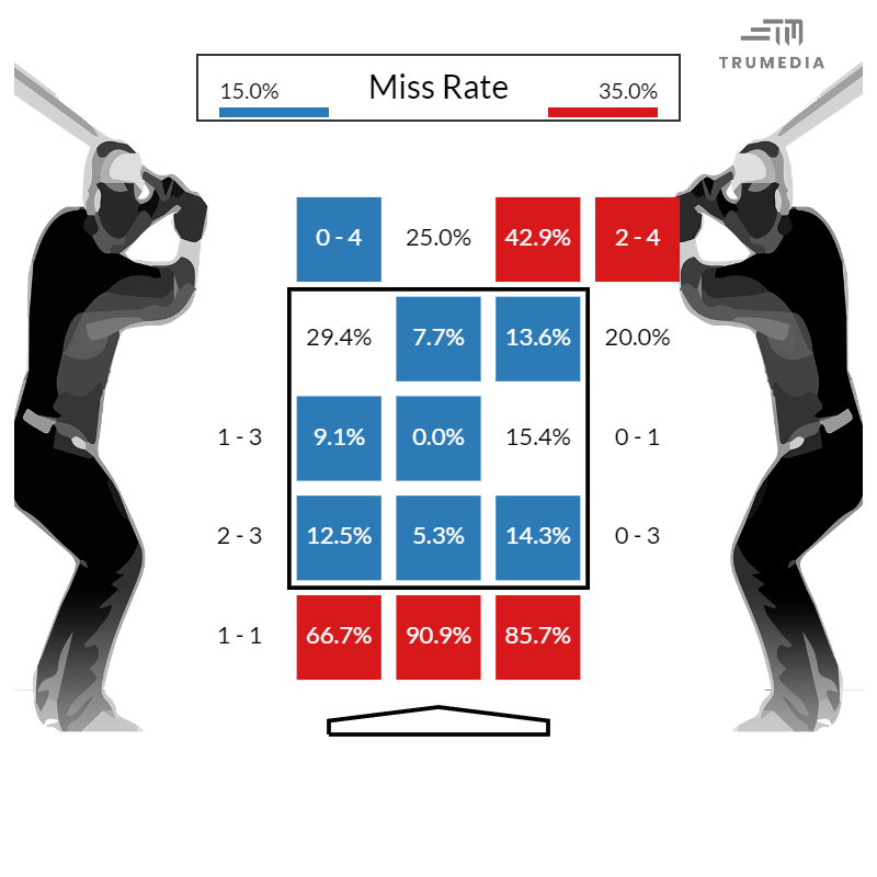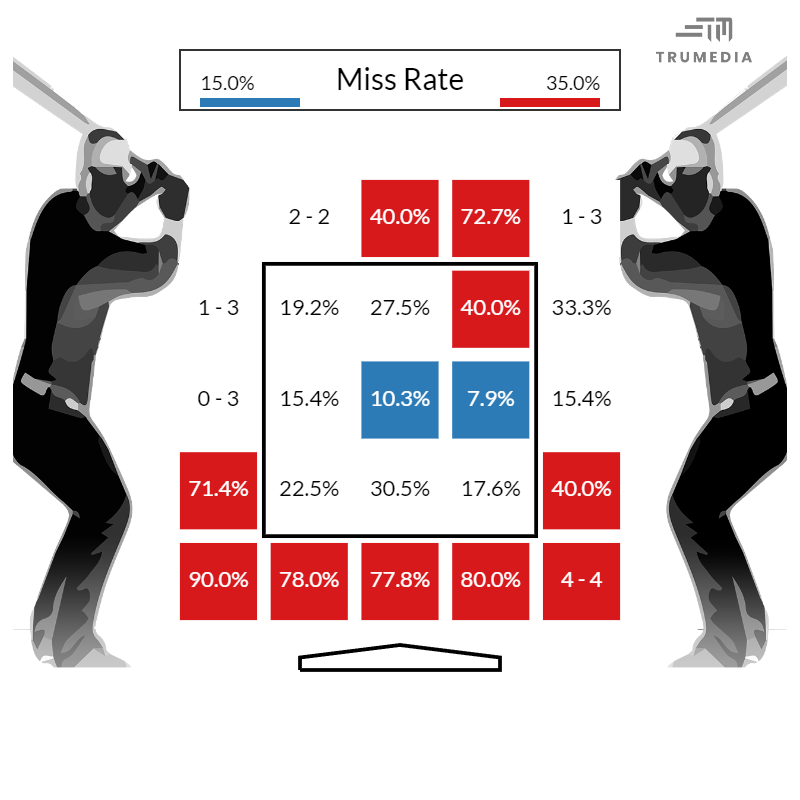 The overall result can be seen in the amount of swings and misses that Julian Merryweather got between 2022 and 2023. Looking again at the charts provided by TruMedia, Merryweather did much better in 2023 (left) compared to 2022 (right). He continued to get chases below the zone as he had done previously but also began to get more swings and misses in the zone. It should be noted that Merryweather did walk more hitters in this approach, but gaining more swings and misses in the zone will be good for a pitcher who will walk a few more.