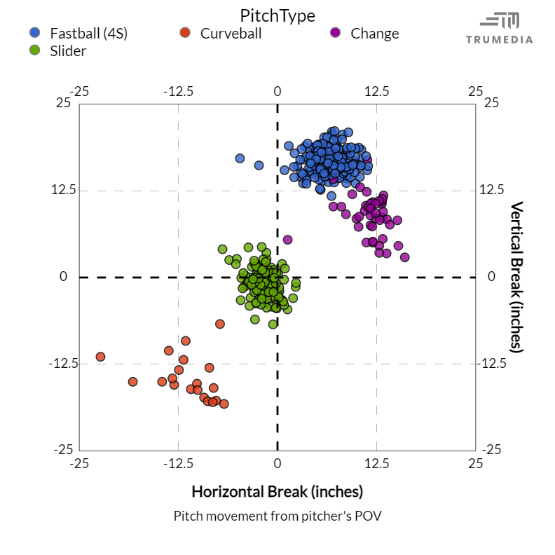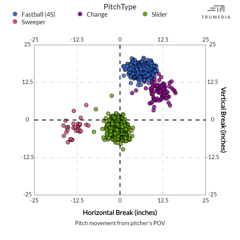 More importantly, the consistency and shape of his pitches improved. Below are charts that show the horizontal and vertical movement of his pitches from 2023 (left) and 2022 (right). Notice how more consistent the changeup (depicted in purple) is. Even though he decreased the pitch usage, the pitch is far more concentrated in the same area. He also added a sweeper (salmon/pink) instead of a curveball, which began to distinguish itself and separate itself from the slider (green). Again, it's a pitch he doesn't use often, but it gave him a new addition to his arsenal... something with true horizontal instead of vertical movement.