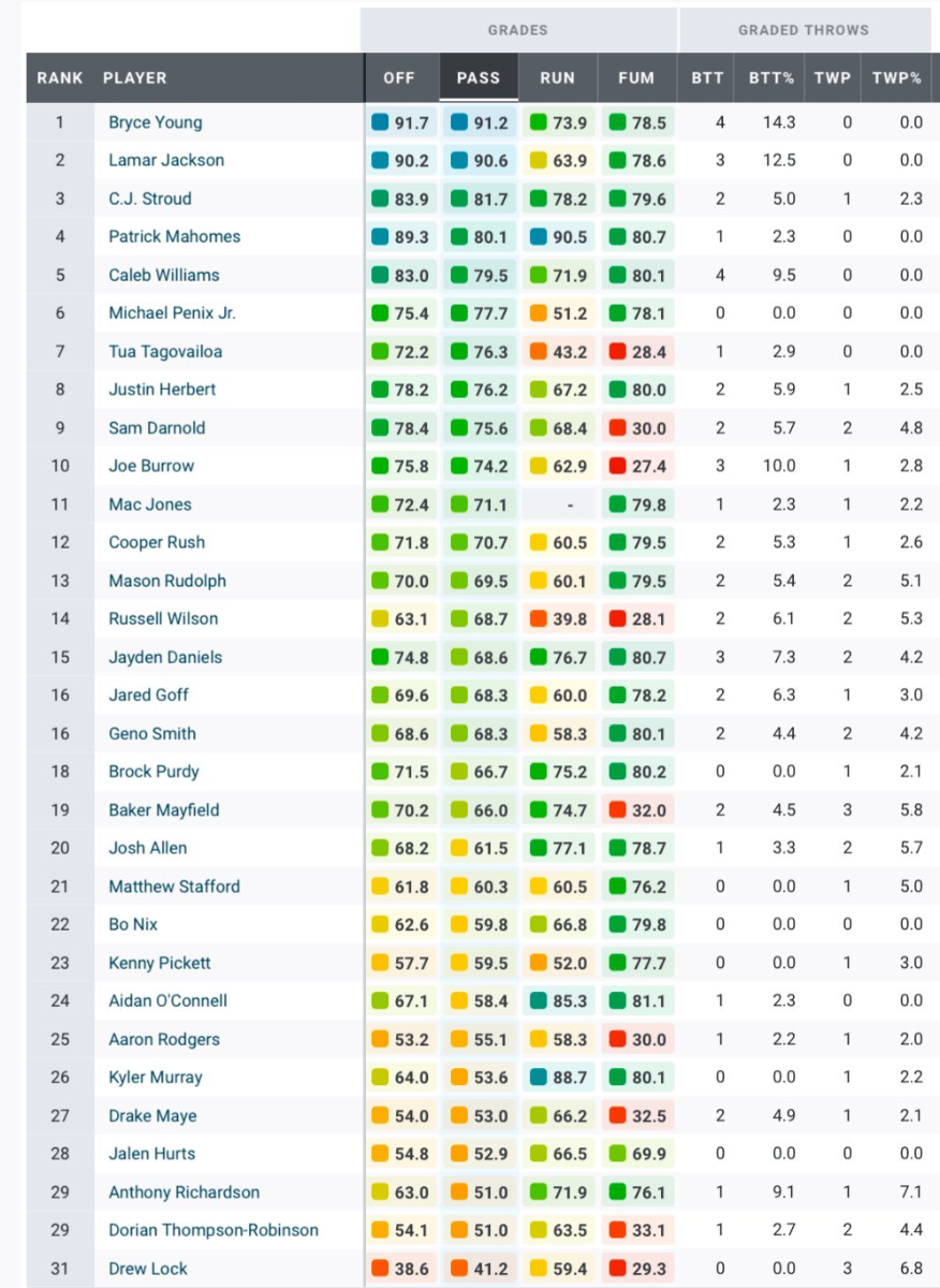 Caleb being ~47.9 or whatever on the season however feels about right: if 50 is a league average season by an NFL QB, he is probably exactly that when you factor in his whole season. Which, for a rookie QB, is totally fine.