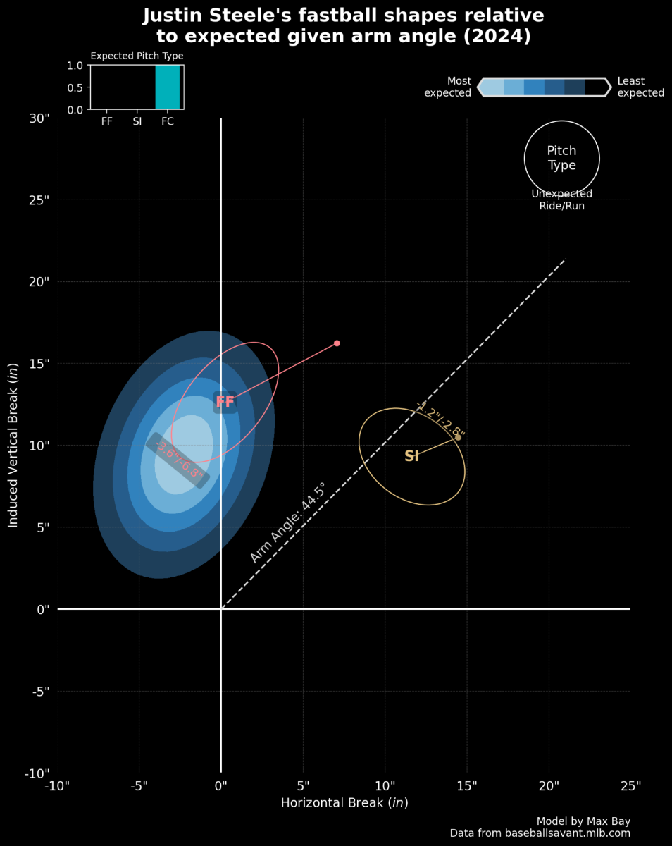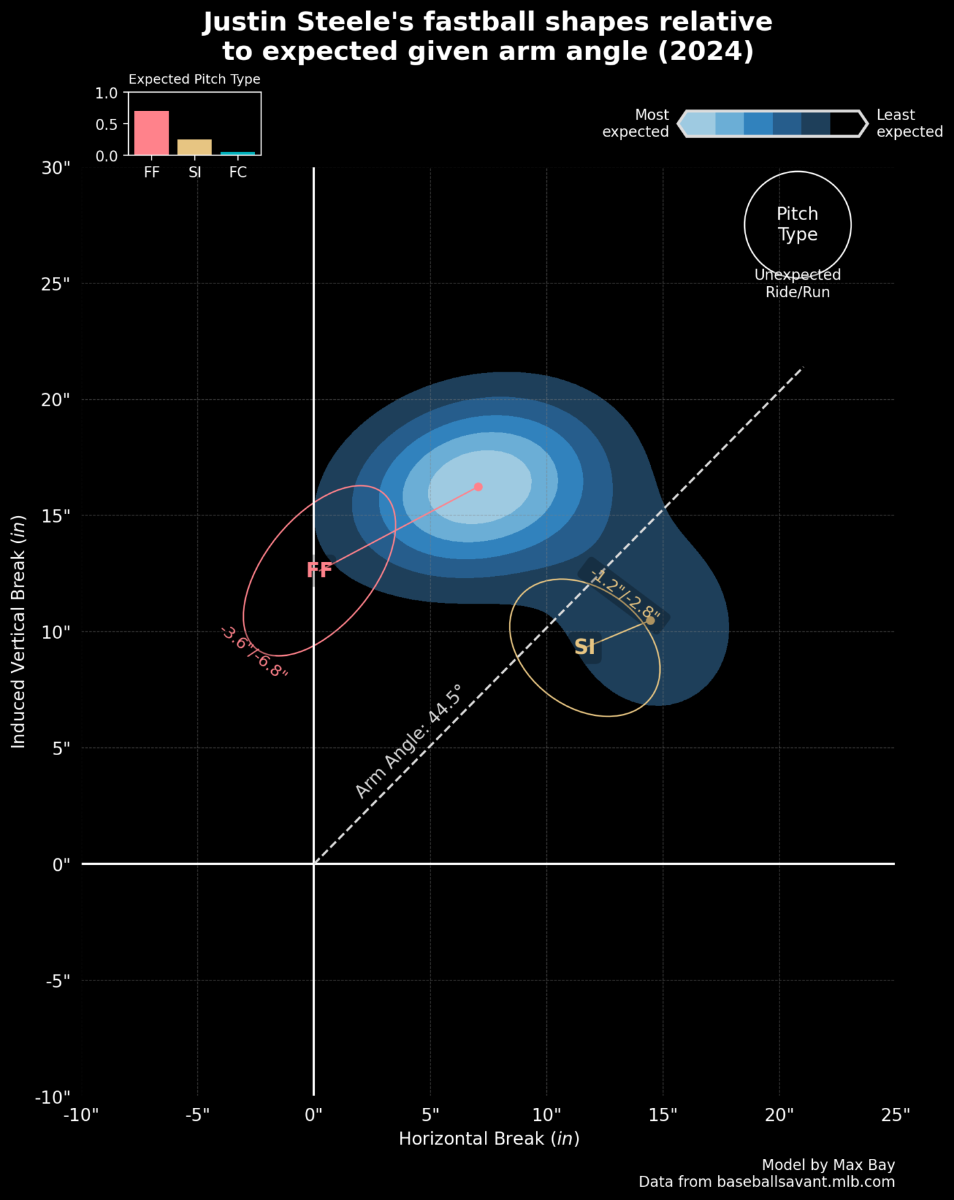 Life as a two-pitch starter is not easy. Brown's own teammate, Justin Steele, has sort of proved that it's still possible, with his cutting fastball and good slider, but even he has steadily increased his usage of the changeup, curveball, and sinker of late. Besides, he's able to get away with a slimmer repertoire partially because his fastball shape baffles hitters. Using Max Bay's Dynamic Dead Zone app, consider what hitters expect Steele's fastball to do based on his arm slot (the blue gradient topographical field in the background), compared to what his heater actually does.