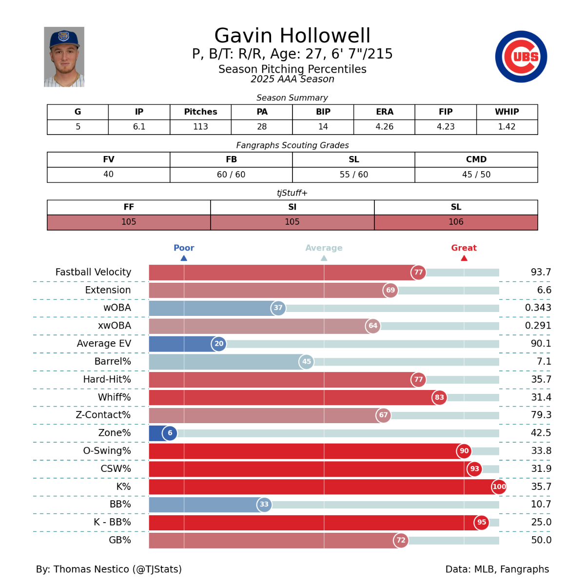 If you can generate chase with Hollowell, if he can sit that sweeper on the outside against RHP there's a guy who can be used. His arm angle as Matt outlined in his article yesterday is funky, so deception is his friend. I don't think the Cubs have a back end guy, but if you told me he was Tyson Ross who threw a bit harder, I'd believe you.