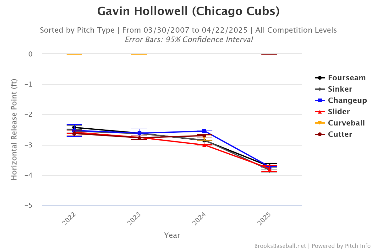 Hollowell won't step into a high-leverage role for the team. He's more likely to be used as a bridge when a Cubs starter has a short outing, or as a sharp zig against the zag of (for instance) the high-slot, left-handed delivery of Shota Imanaga or the equally wide-sweeping but lefty look of Matthew Boyd. He's a temporary solution, at least for now, to the team's need for depth and fresh arms in the pen. That said, he's genuinely improved this season, and the new placement on the rubber gives him a new way to pose hitters difficult questions. As spare arms slotting into the underbelly of the bullpen go, Hollowell is a fairly interesting one.