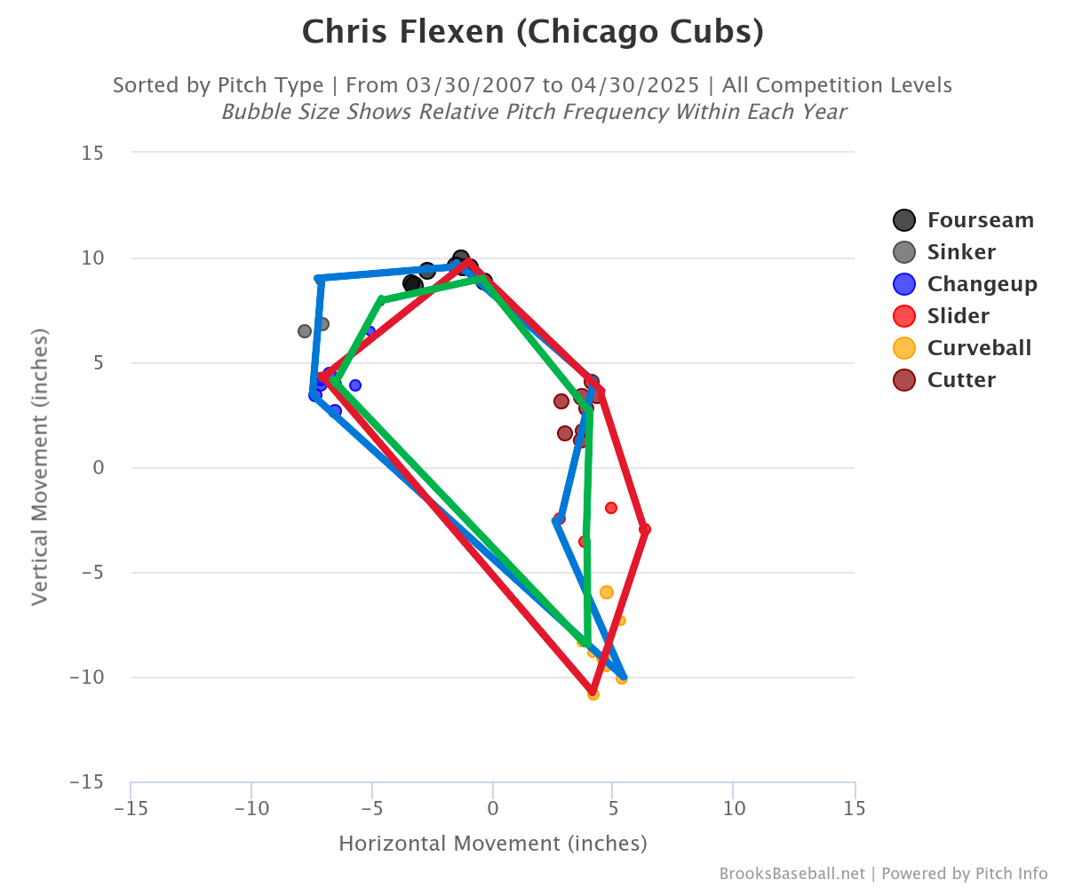 Here are the yearly averages for horizontal and vertical movement on each of Flexen's pitches. I've drawn connecting lines to show the relationships between the components of his arsenal for 2023 (green), 2024 (red), and 2025 (blue).