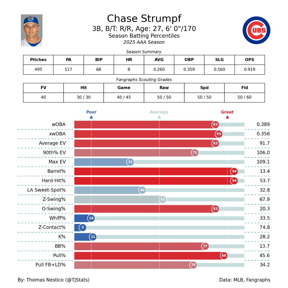 However, this isn't about the past; it's about the present, and this year, Chase Strumpf has seemingly made some progress. The now-27-year-old has had a resurgent year with the I-Cubs, posting a .260/.359/.560 line, which is 32% better than the league average. His K% has dropped to 28.2%, the lowest it's been since Strumpf's time in Tennessee during the 2021 campaign, while maintaining a strong 13.7% walk rate. If there's one thing the initial scouting report got right, it's that the kid takes his walks.