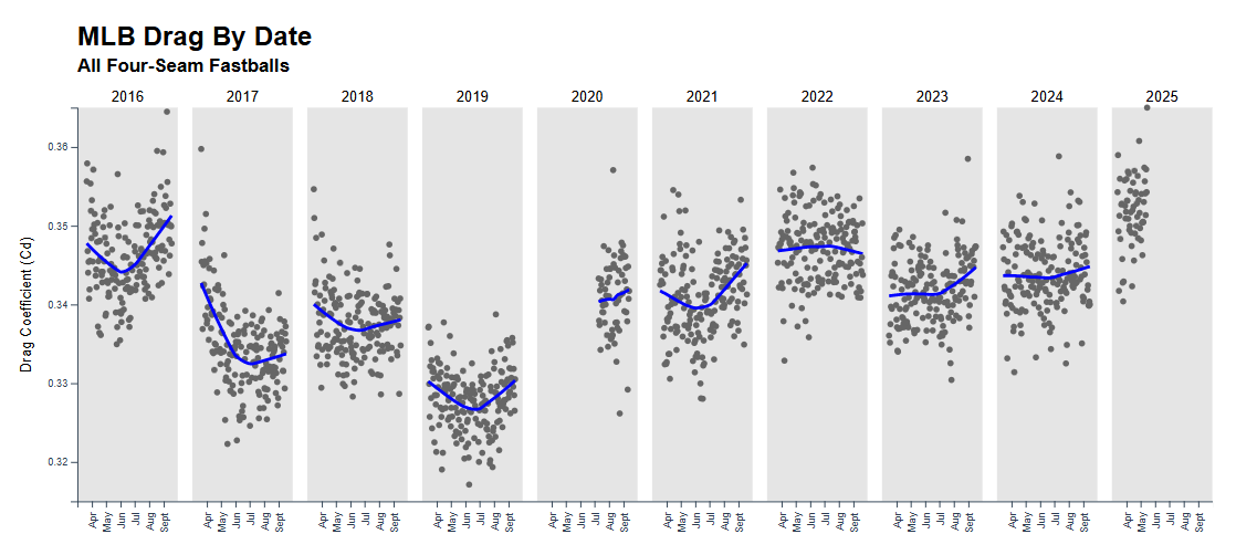 The league's collective slugging average is a weak .394, but we don't need to depend on outcomes to tell us whether the ball has changed. At Baseball Savant, a site owned and operated by Major League Baseball itself, there's a Drag Dashboard that shows the daily average values for drag on the ball, calculated using the loss of velocity from release to home plate on four-seam fastballs—and a cursory check of it will tell you that drag is way, way up in 2025.