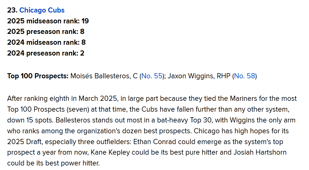 Pipeline Cubs top 30 is out:  https://mlb.com/milb/prospects/2026/cubs/