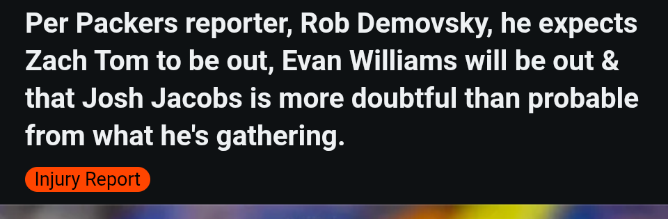 Josh Jacobs, Evan Williams and Zach Tom all didn't practice.  Jacobs keeps talking like he's gonna play but he hasn't practiced all week.