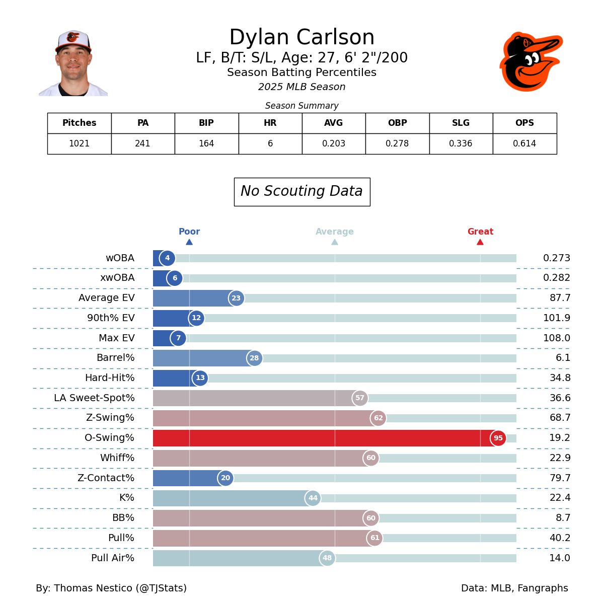 His low chase rate will keep him in the Opening Day conversation, but it is difficult to see him separating himself meaningfully from the other options. His exit velocity data suggests that his Triple-A OPS should be taken with caution, as it is unlikely to translate into an above-average major-league offensive profile.
