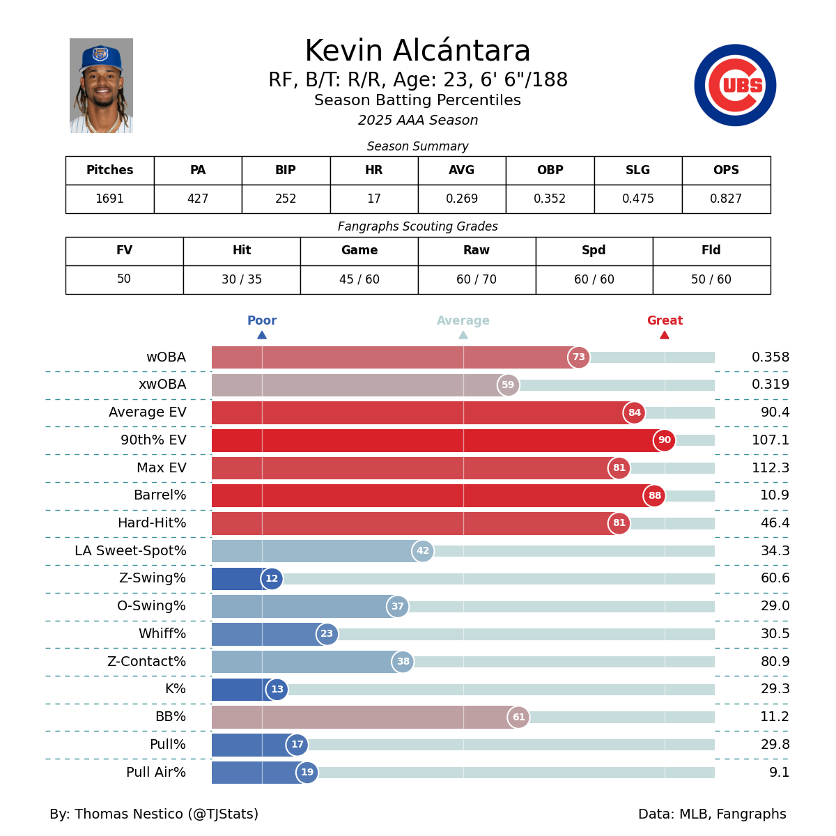 Despite his ability to drive the ball with authority, however, Alcántara has major swing-and-miss concerns. He struck out 29.8 percent of the time in Triple A, and strikeout rates often increase upon promotion to the majors. In his brief major-league stint in 2025, that rate climbed to 33.3%, though the sample is too small to draw conclusions therefrom.