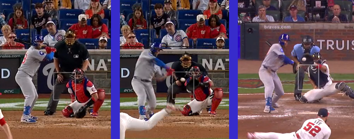 The umpire isn't consciously looking at the way Busch's body moves into his hitting position when they decide whether the pitch is at the knees or below them, but there's a sense impression happening even in that instant of ball reaching mitt and a call needing to be made. This hasn't been a huge problem for Busch, but because he also dips that back leg and sinks into his hitting position even on takes (see the image on the right, above), he sometimes gets balls called strikes just below the zone.