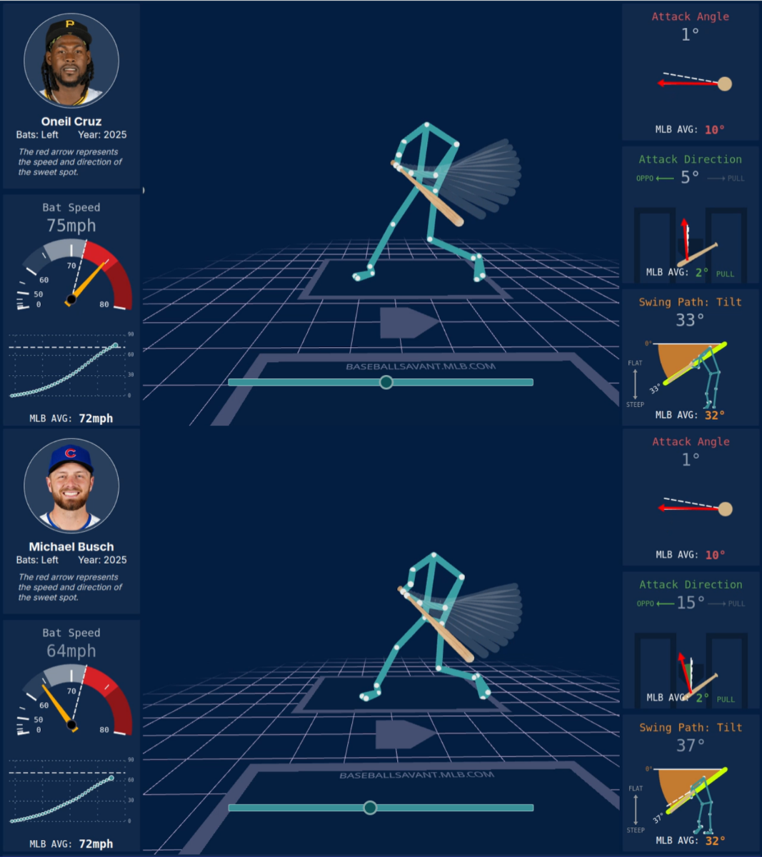 Combine the crouch and the length of his stride, and Busch gets very deep into his legs. Again, refer to that center image, and note how low his left shin gets to the ground. That's part of his natural stroke, but it sets a low bottom rail for his zone, visually. Though his knees are bound to be lower than those of the towering Oneil Cruz, when you compare a composite animation of those two players' swings, you can immediately see that more than height separates them.