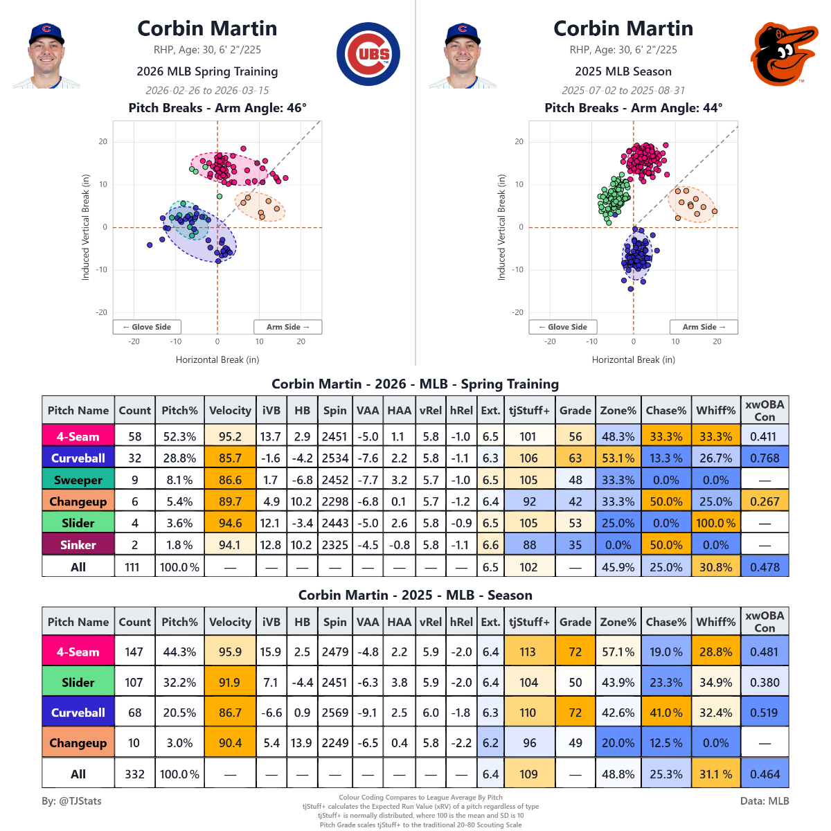 First of all, Martin has moved over on the mound this spring. His arm slot is little altered from last season with the Orioles, but whereas he started on the third-base side of the rubber in 2025, he's on the first-base side this spring: