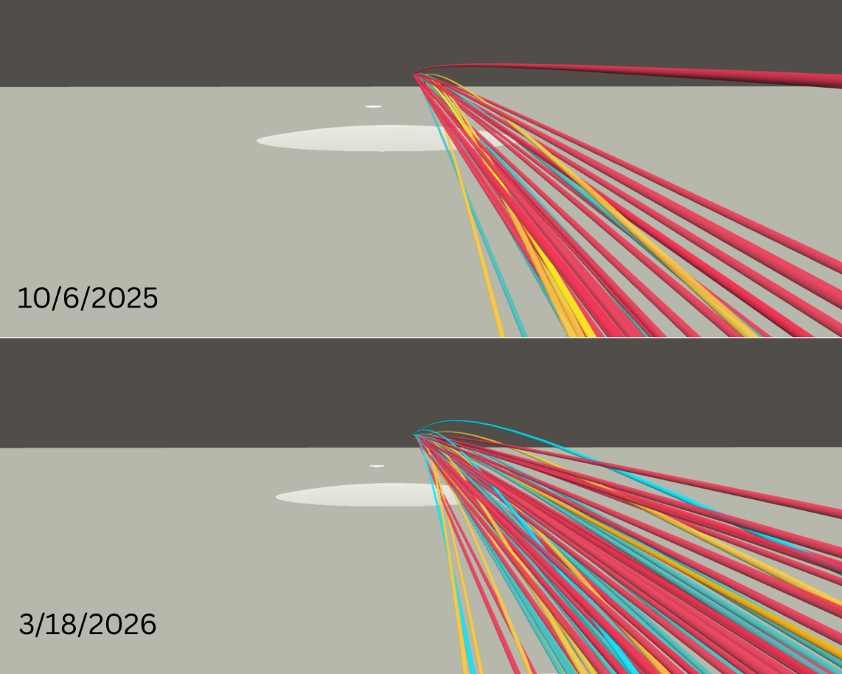 This is also going to benefit him in generating deception against right-handed batters. Compare these two 3-D animations of the trajectories of Imanaga's pitches, from the approximate vantage point of identical right-handed batters. The top image is from his appearance against Milwaukee last October; the bottom one is from Tuesday.