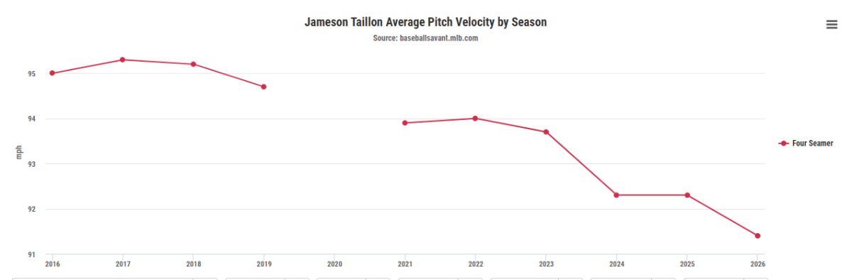 Luckily, Taillon seems to understand the need to change the way he attacks hitters based on his diminished velocity, as evidenced in his pitch usage. Last year, Taillon primarily used three pitches against both right-handed and left-handed hitters. Against righties, he primarily used his sweeper (32%), four-seamer (31%), cutter (23%); against lefties he was all four-seamer (44%), curve (24%), change (20%). In 2026, he has the same three-pitch mix against right-handers, but he has altered the usage; he has thrown cutter (31%), sweeper (29%) and 4Seam (28%). Against lefties, he has expanded his pitch mix to include the cutter (23%). Clearly, he has intentionally been throwing a lot less four-seamers and a lot more cutters, especially to lefties. The cutter has been dominant so far in 2026, generating a .071 batting average and .286 slugging against. Throwing that in place of his primary heater is probably a good idea, so why are the results less than stellar?