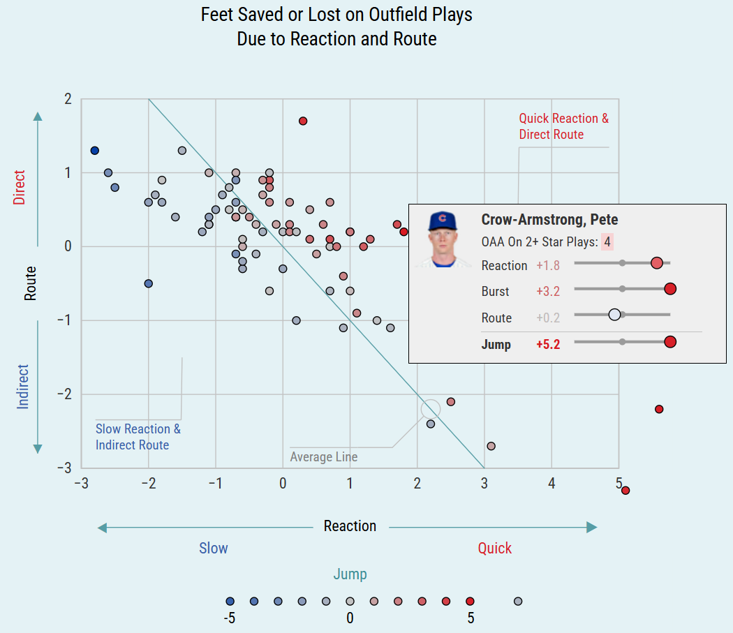 This season, Crow-Armstrong sits atop that Jump leaderboard. He gains 5.2 feet of ground across the three components, relative to the average outfielder, with a good (+1.8 feet) initial reaction but an otherworldly (+3.2 feet) burst in that secondary moment of pursuit. He's also more efficient in his routes than the average outfielder—and, again, here we risk underrating him. The more a player moves in that 3-second window, the more likely they are to waste at least a little bit of that movement. That's not a new idea, or even a bad thing; it's part of the conscious tradeoff outfielders make all the time. However, Crow-Armstrong doesn't lose efficiency to his remarkably quick response on fly balls. He shoots himself at the ball's landing spot like he's a missile-defense system, and he never misses.