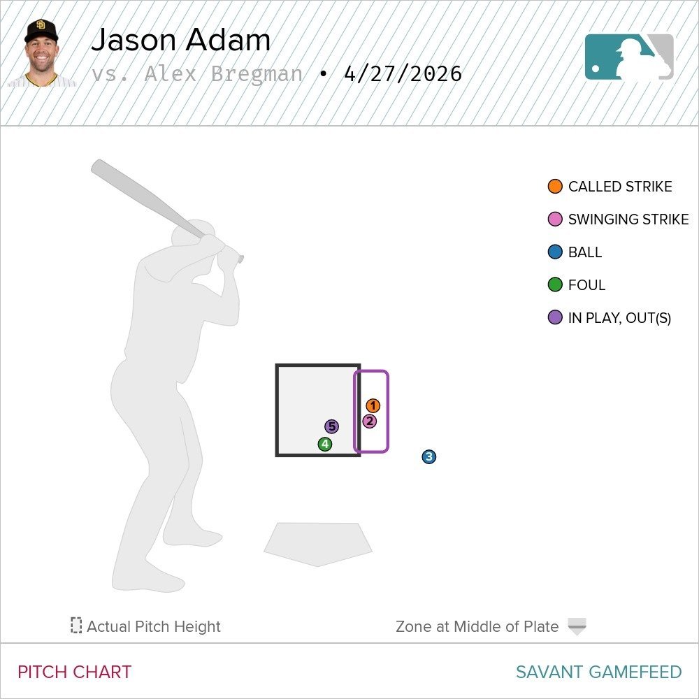 On a two-run Castellanos single, the Padres retook the lead, for good. Along the way, they had one more real chance to flip the script again. In the top of the seventh, Pete Crow-Armstrong drew a leadoff walk. He stole second and advanced on a convoluted fielder's choice, so he carried the tying run at third base with one out. Michael Busch went down on strikes, though, which left it up to Alex Bregman. Here's a visual look at that showdown, between Bregman and Padres reliever Jason Adam.