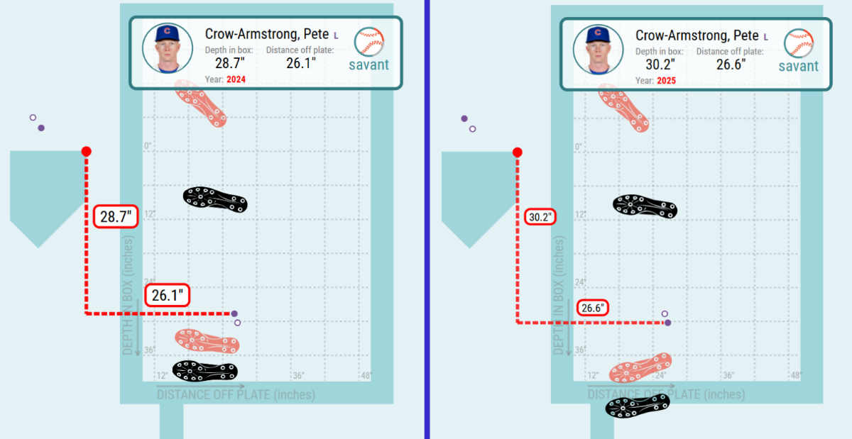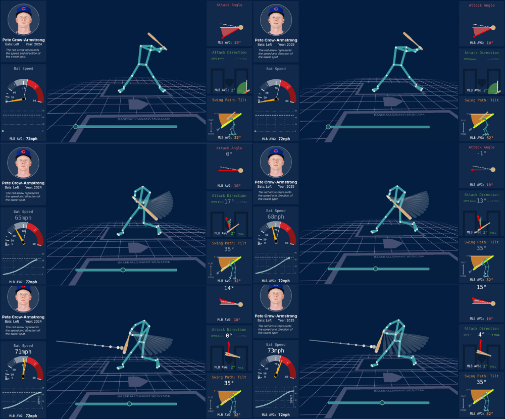 Although Crow-Armstrong's swing is steeper, slower and targeted differently than Juan Soto's, it's a bit instructive to compare the way he gets into his lower half to the way Soto does so. With his new stance and stride, Crow-Armstrong—like Soto—stretches the elastic aspects of the body and maximizes the torque he eventually produces. His swing speed increased by nearly 2 MPH in 2025, but it wasn't because of dedicated bat speed training. He just got much more aggressive, forcing his body into a position where it had to fire a harder swing.
