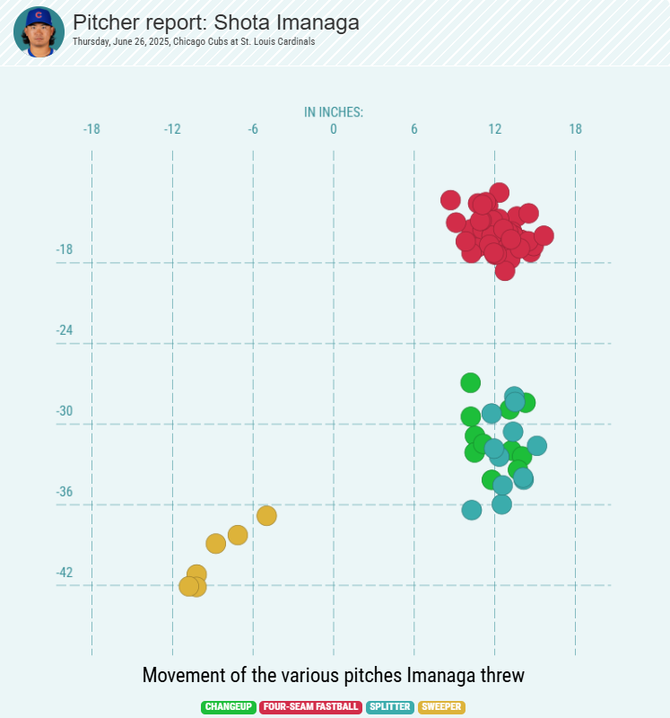 It was particularly fun to watch Imanaga work opposite Cardinals starter Andre Pallante, who has exceptional fastball movement characteristics, just as Imanaga does—but in the opposite way.