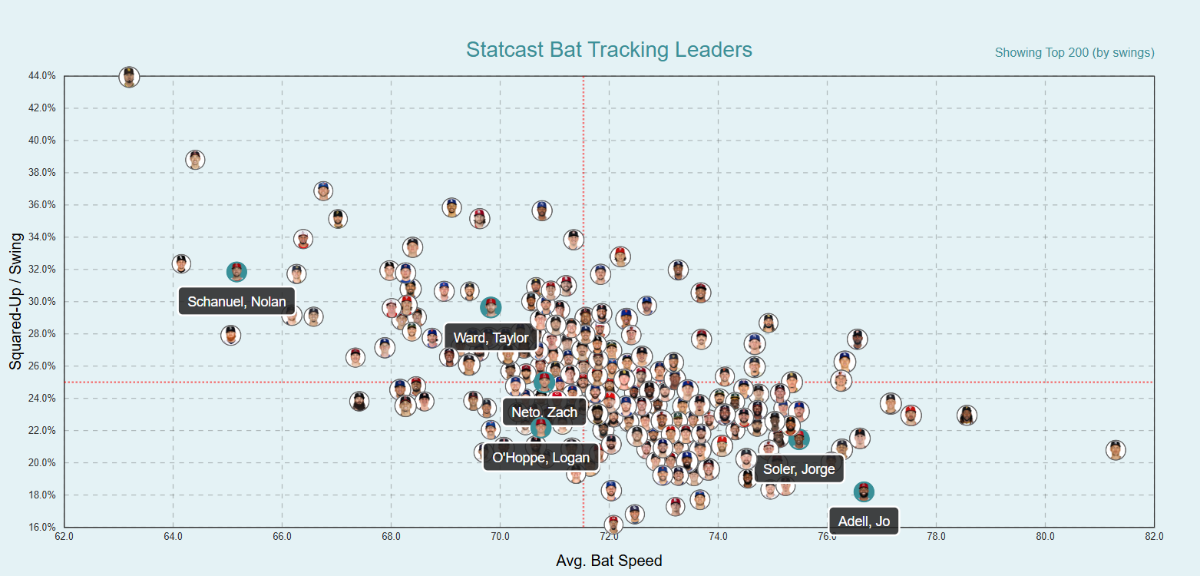 Some of their part-time players and guys who missed time because of injuries don't appear here, but would make it more obvious how much they prioritize this skill: Miguel Sanó, Trout, Mickey Moniak, Keston Hiura, Brandon Drury, Matt Thaiss, and others were specialists in swinging fast.