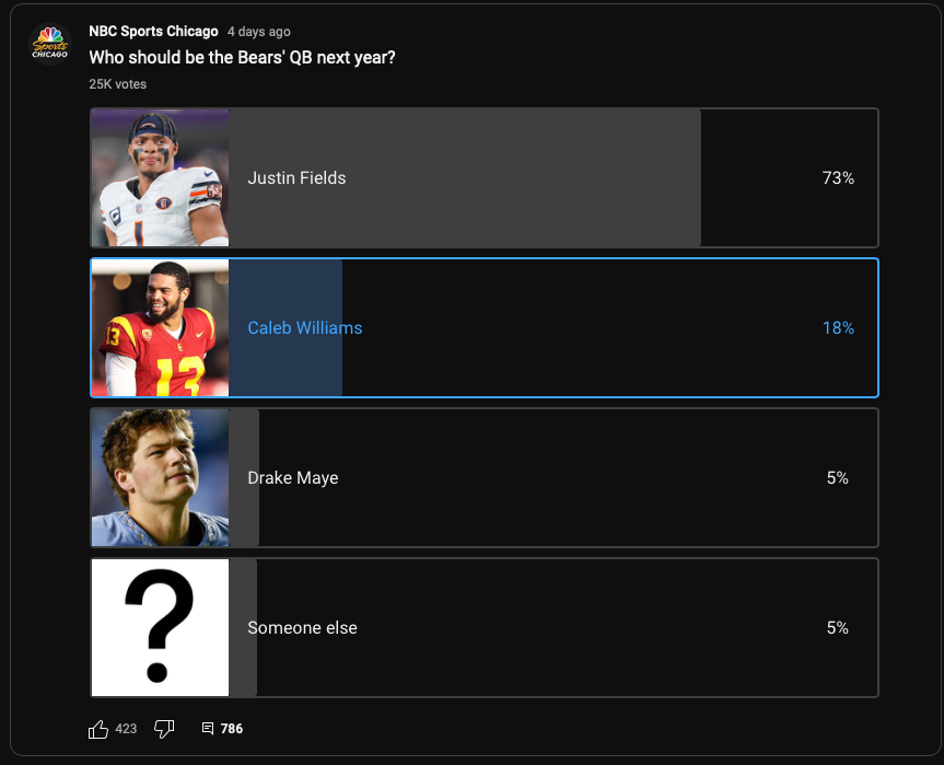 Anecdotally, he also seems helpless when neither Kmet and Moore are on the field. Now, he's got a bunch of schlubs to throw to beyond them, but the vast majority of starting quality QBs can at least do something with schlub WRs. Fields hasn't shown that.